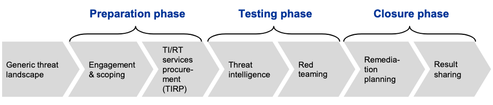 - The testing phase (which includes threat intelligence and red teaming) – During this phase, the procured TI provider prepares a Targeted Threat Intelligence Report (TTI Report) on the entity, setting out threat scenarios for the test and useful information on the entity. Here the TI provider works closely with the RT provider, and the targeted threat intelligence and reconnaissance phases overlap, with the GTL being used as the basis, if available. The TTI Report will be used by the RT provider to develop attack scenarios and execute an intelligence-led red team test of specified critical live production systems, people and processes that underpin the entity’s CFs. The testing phase is a mandatory phase for each implementation of the TIBER-EU framework.